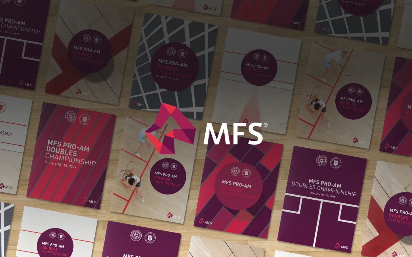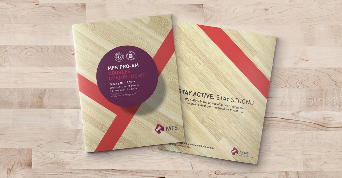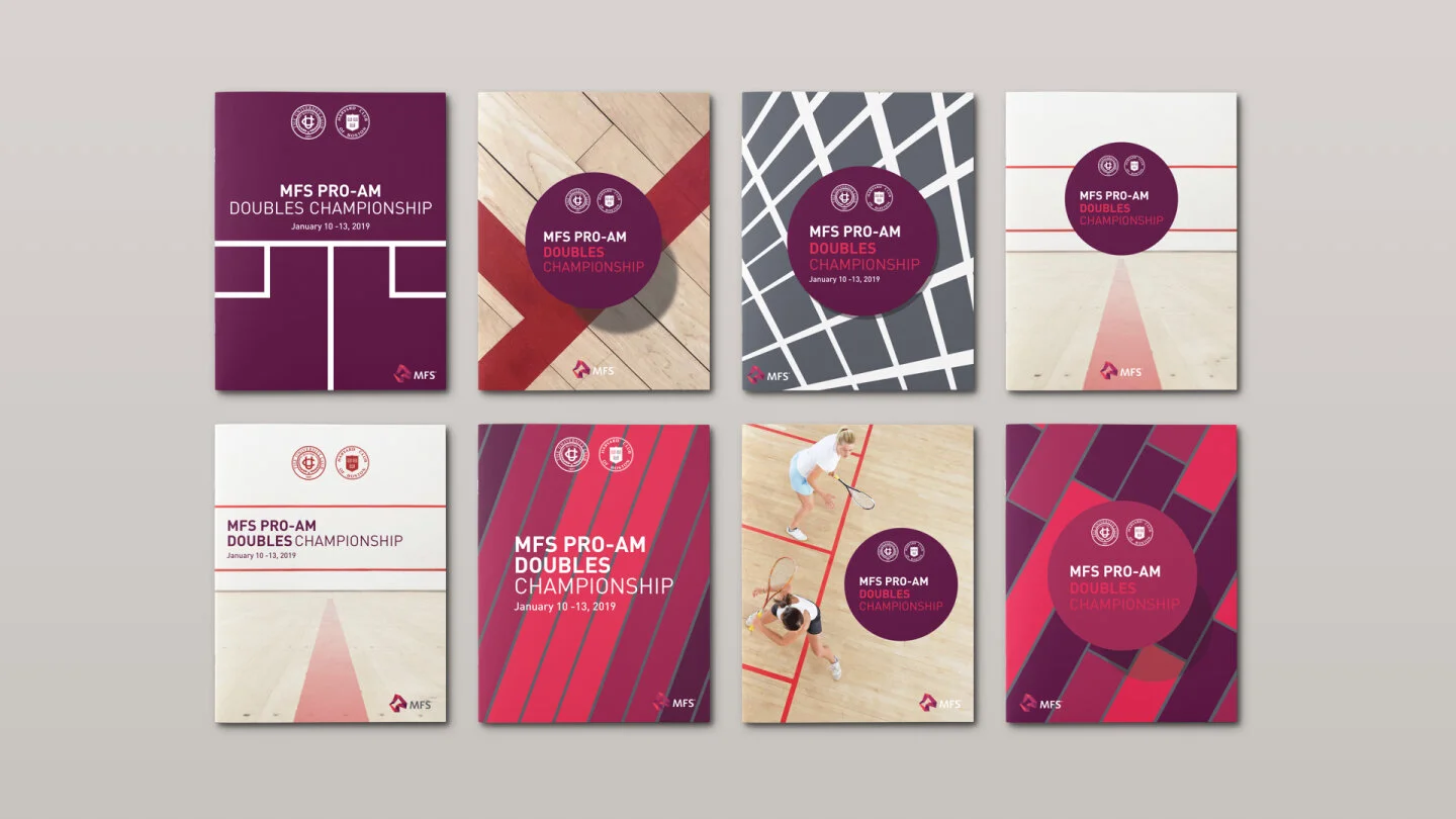 Massachusetts Financial Services (MFS) sponsors a professional squash tournament at the Harvard Club and University Club of Boston every year. Building off of the design from last year, we developed 8 different designs using various squash elements in both photographic and graphical form. The final design was used across print, marketing signage, apparel and more.